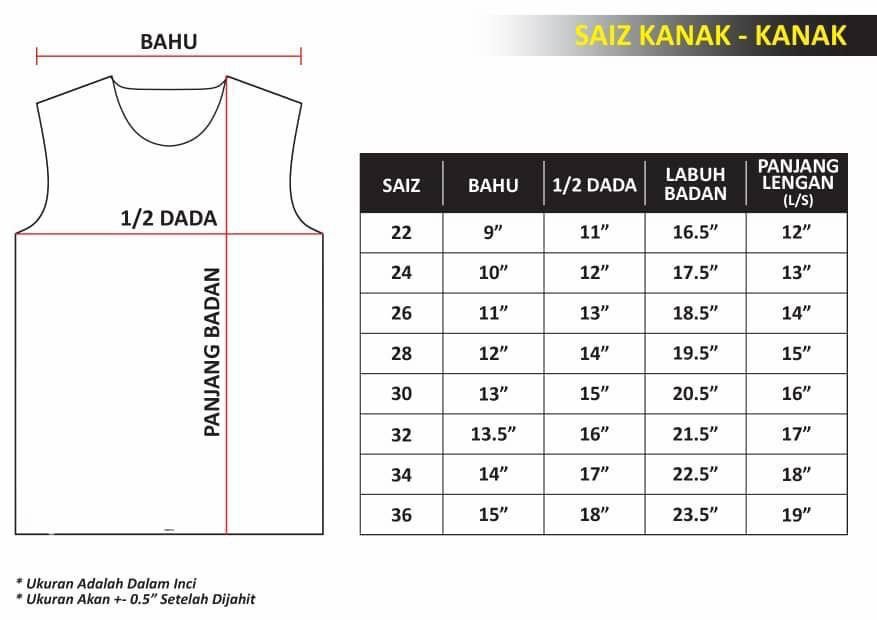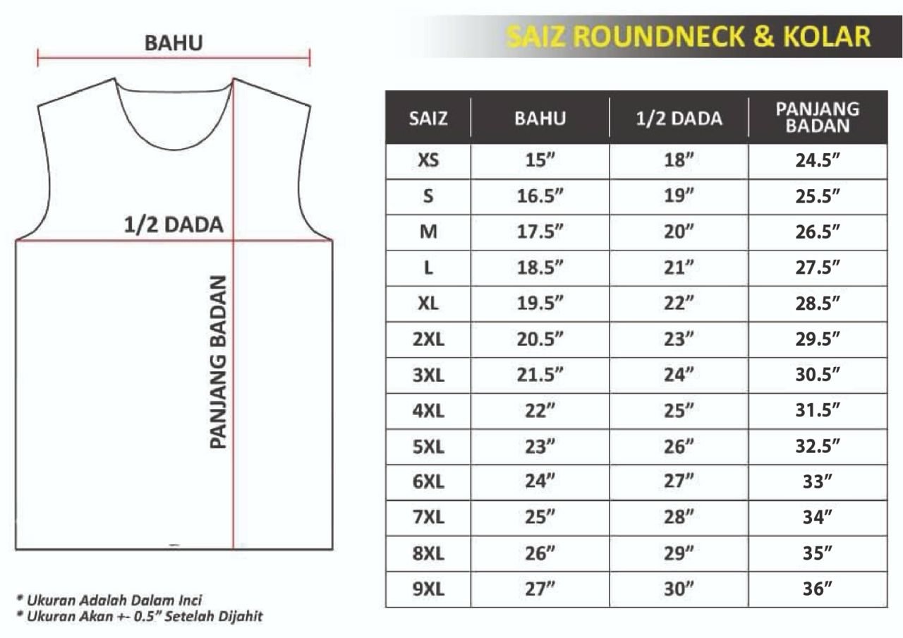 SILA LIHAT DI BAWAH UNTUK MELIHAT SAIZ BAJU. PASTIKAN MEMILIH SATU SAIZ YANG LEBIH BESAR BAGI UKURAN YANG TEPAT
